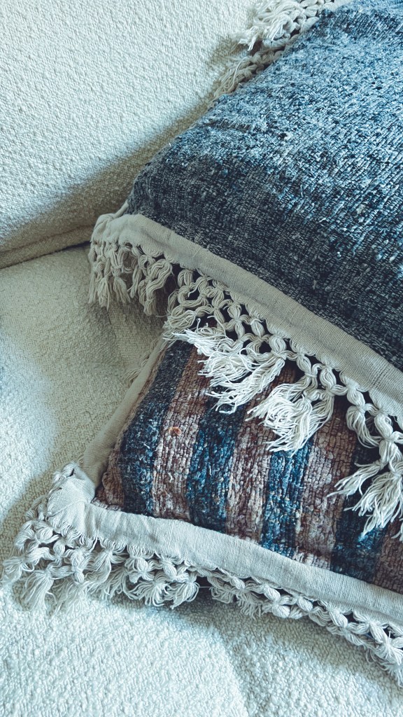And the bouclé upholstery fabric is a great match for these original 70s floor cushions I purchased at an estate sale years ago. I’m less concerned with colour than I am with texture these days, and these irregular woven loops are definitely making me happy.